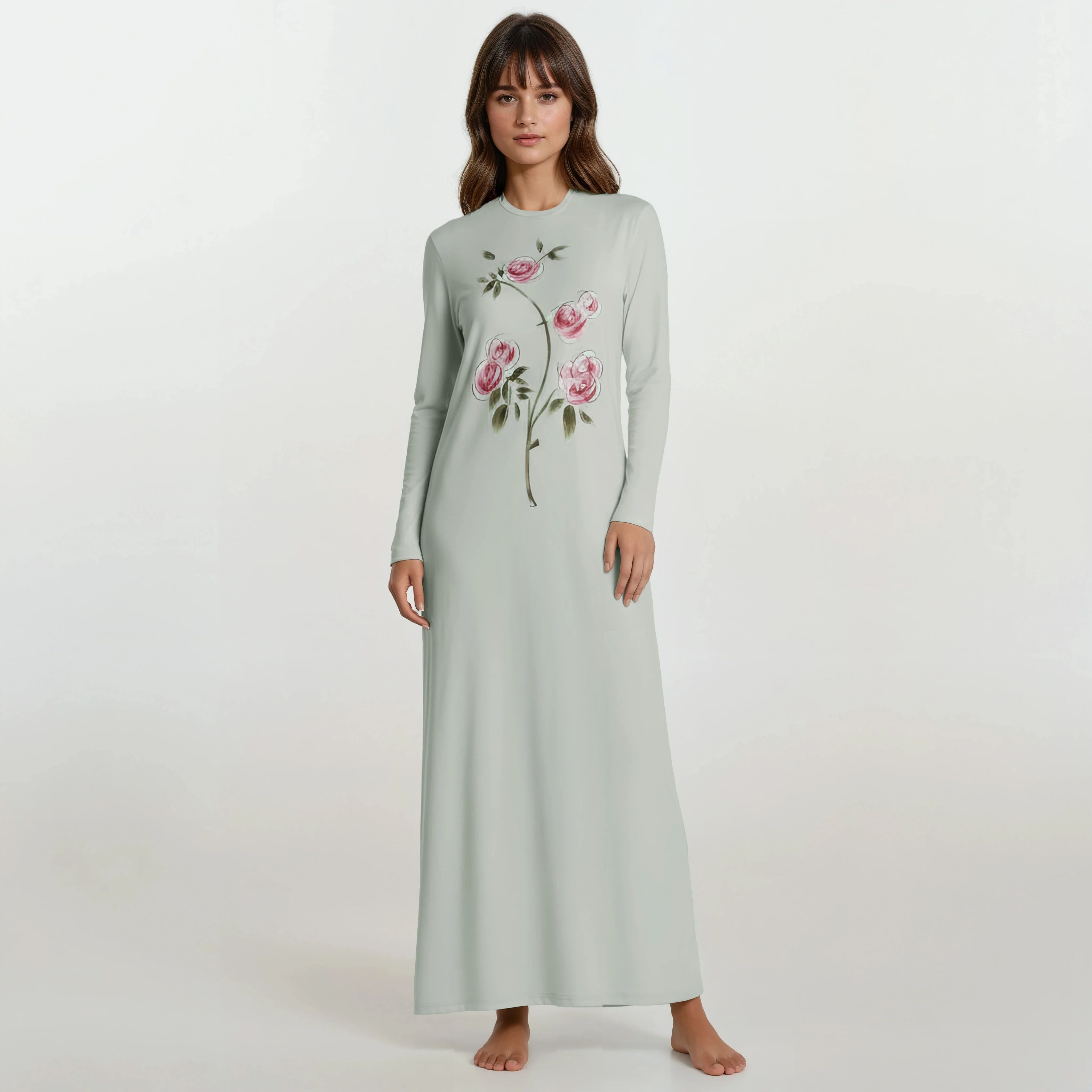 Crafted from a soft, lightweight fabric in a serene green tone, this full-length nightgown offers both comfort and grace.