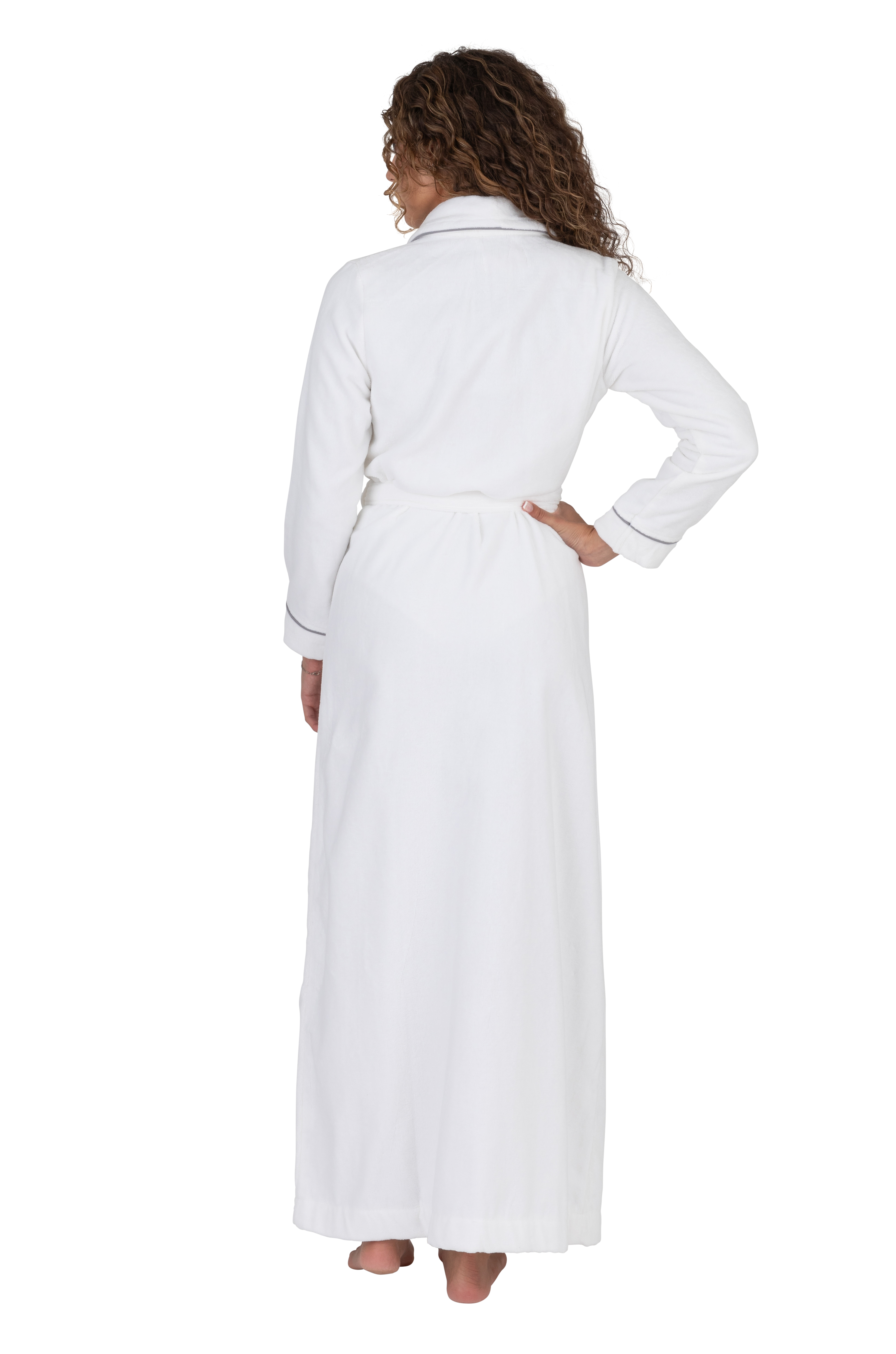 Terry Wrap Long Belted Bathrobe With Piped Trim White Gray