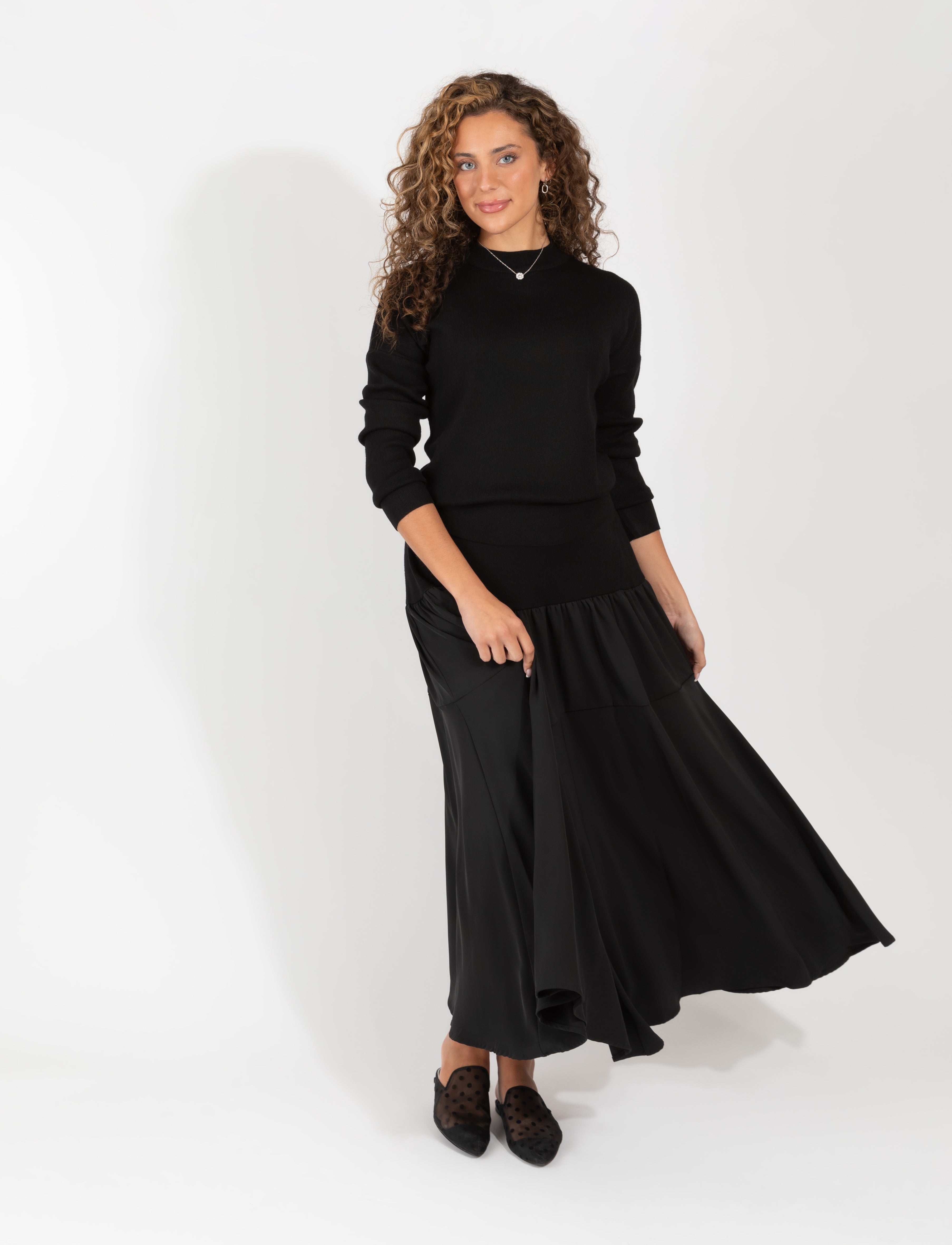 Black Two Piece Set Featuring Fitted Sweater And Flowing Maxi Skirt