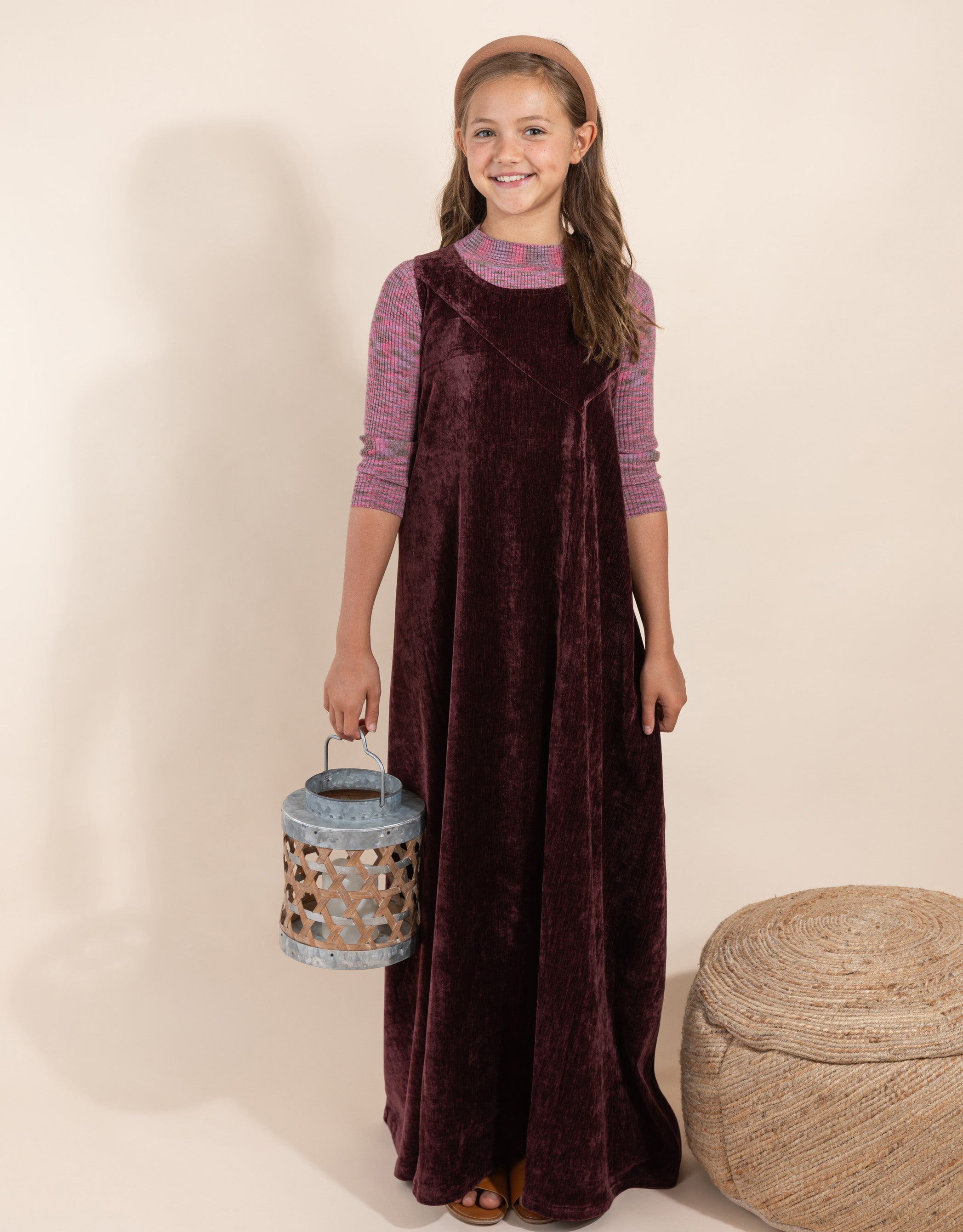 Girls' classic sleeveless jumper in a plush burgundy velour.