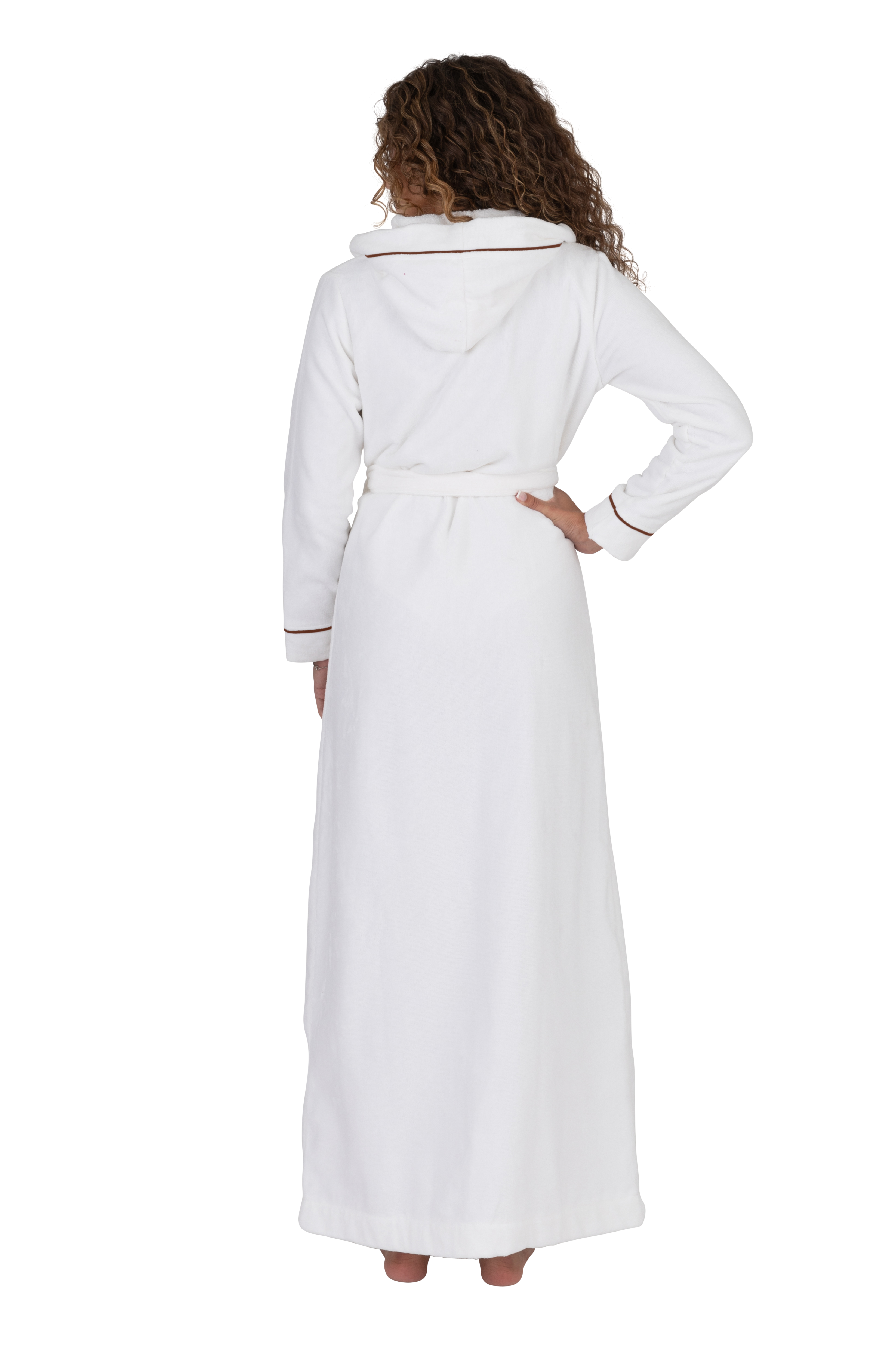 Long Terry Wrap Belted Bathrobe with Hood Piped Trim White Mocha