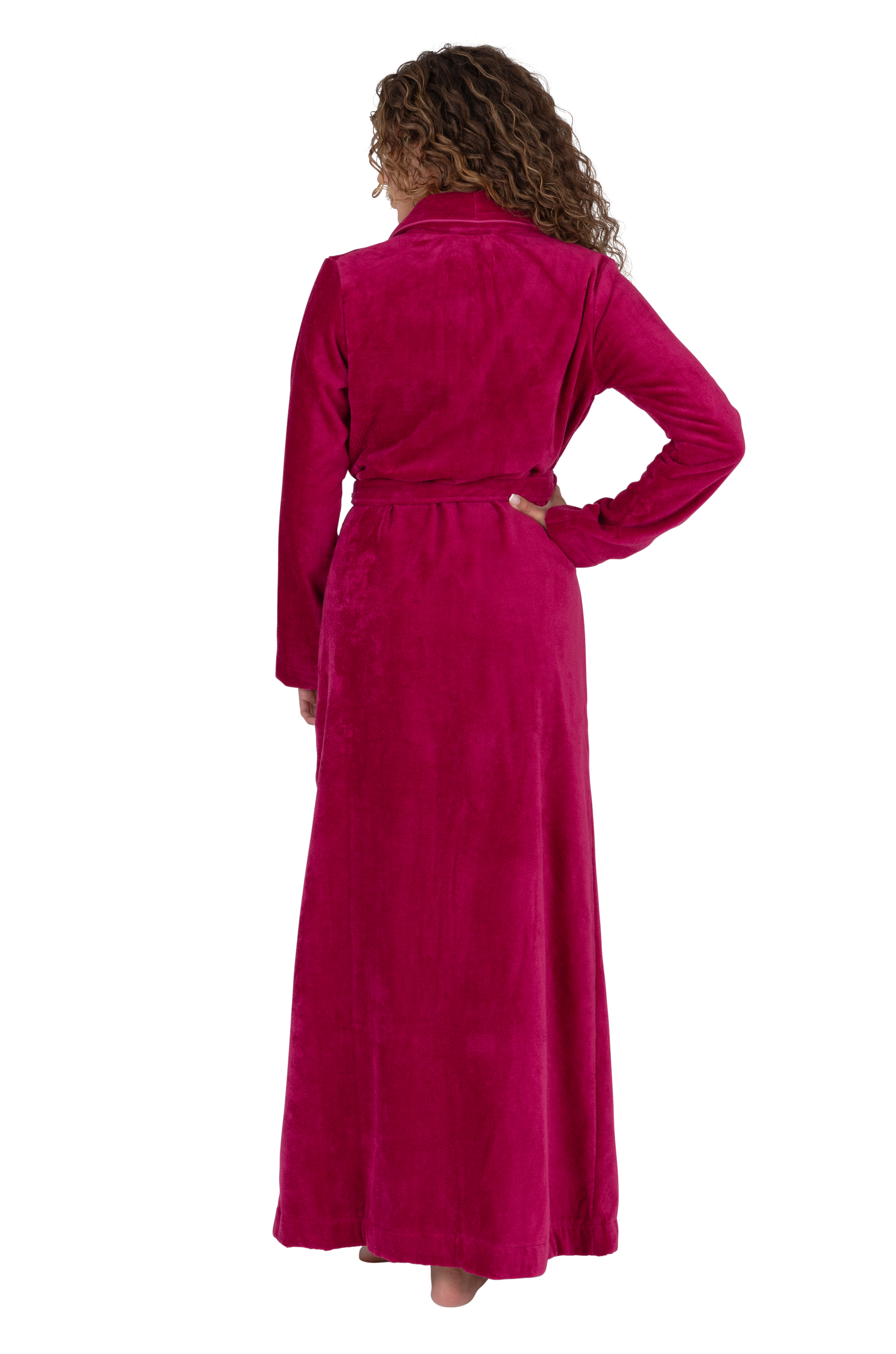 Terry Wrap Long Belted Bathrobe with Piped Trim Raspberry