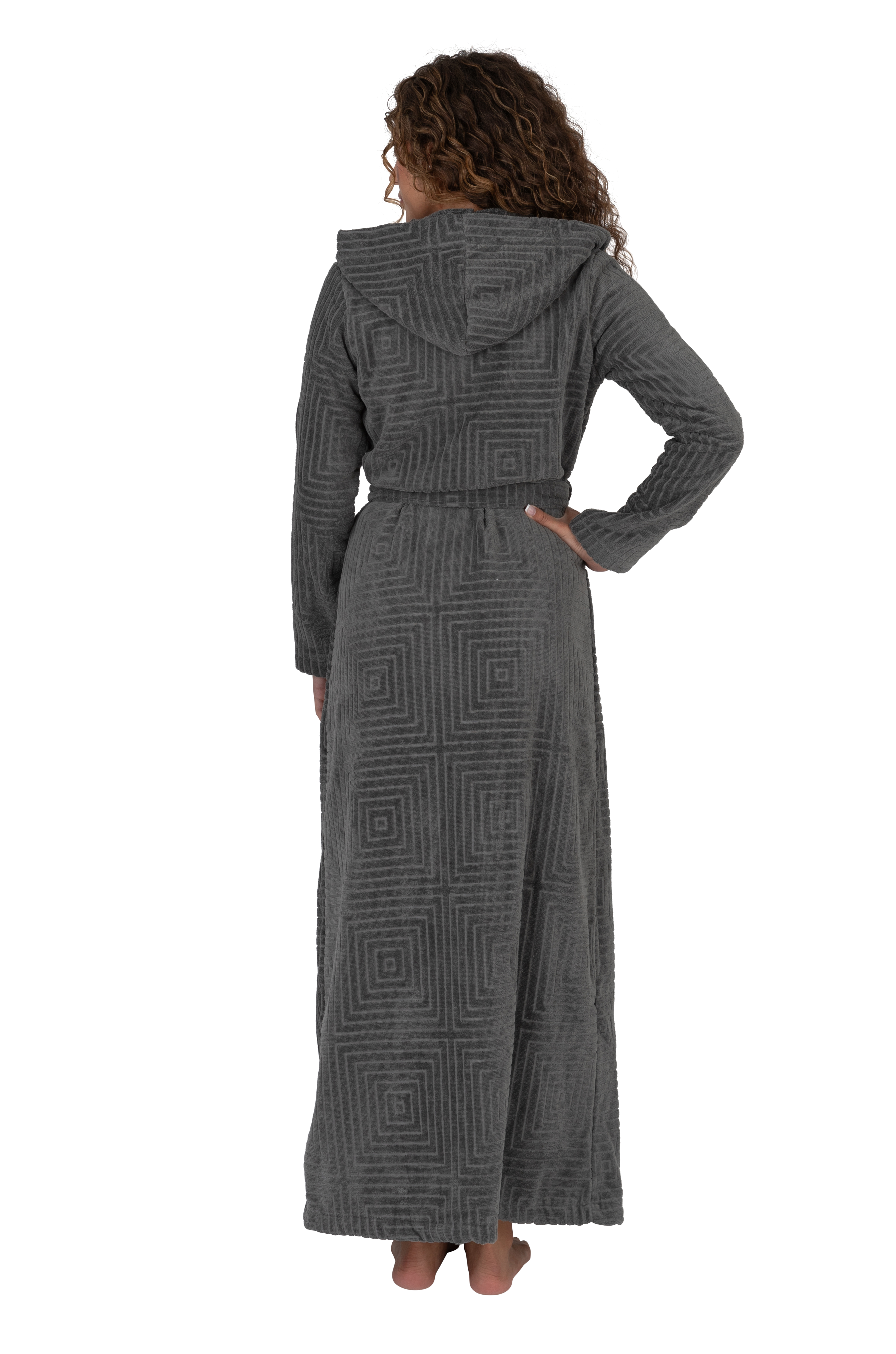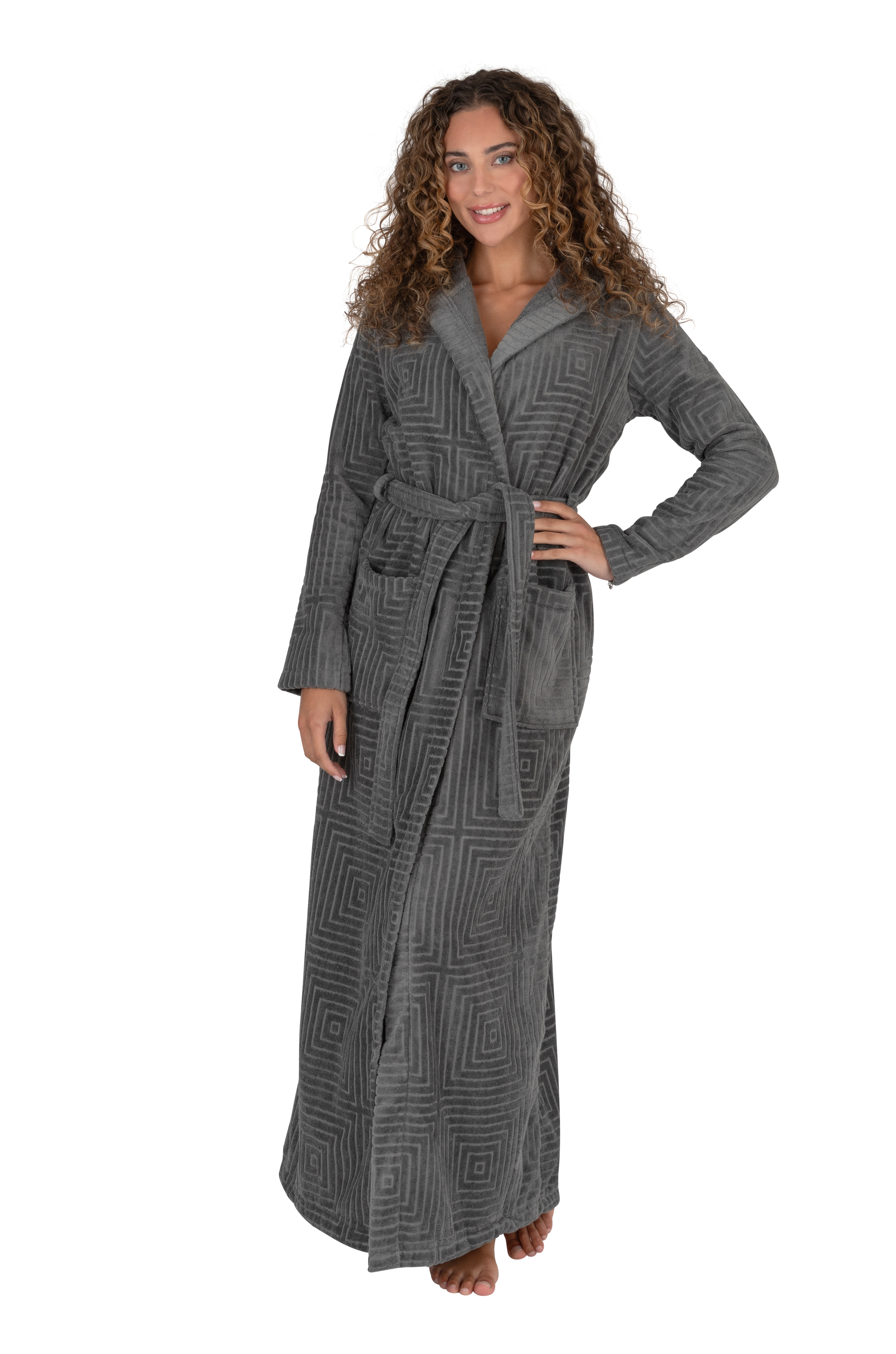 Terry Wrap Long Geometric Belted Bathrobe With Hood Gray