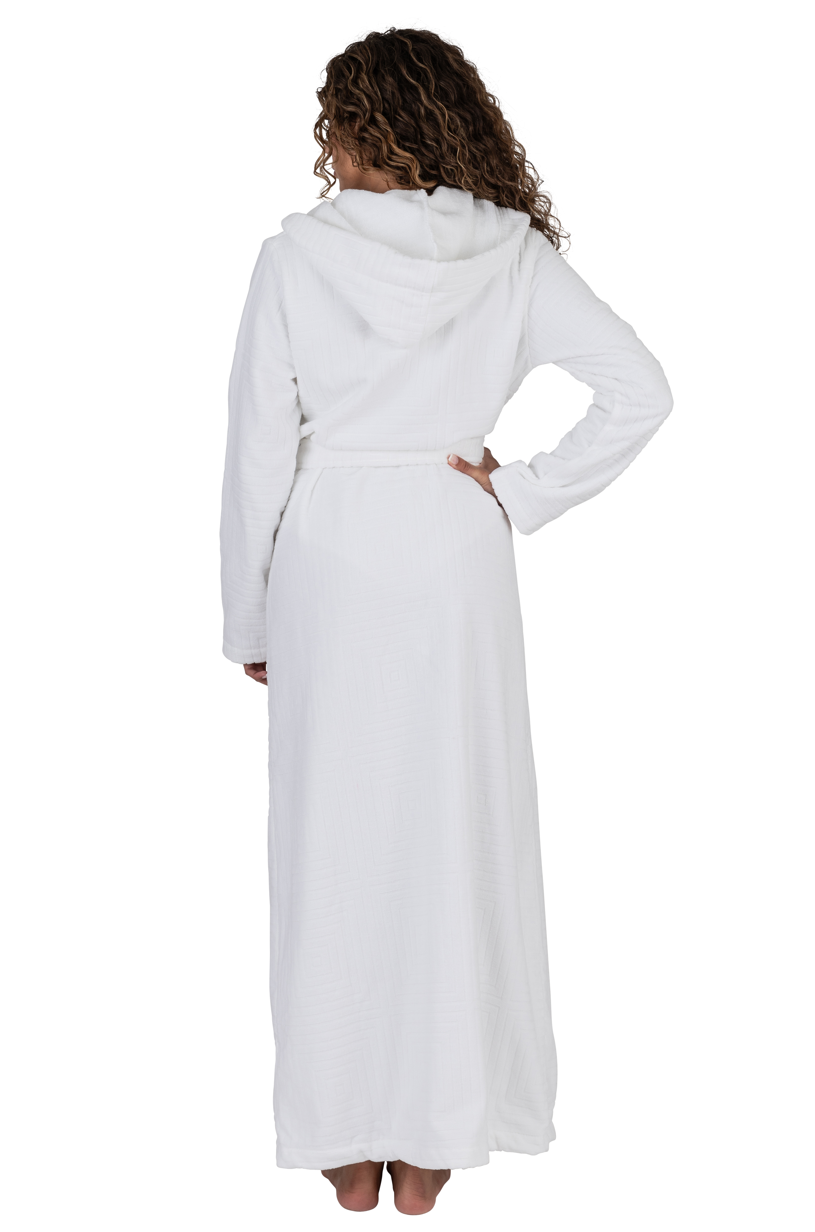 Terry Wrap Long Geometric Belted Bathrobe With Hood White