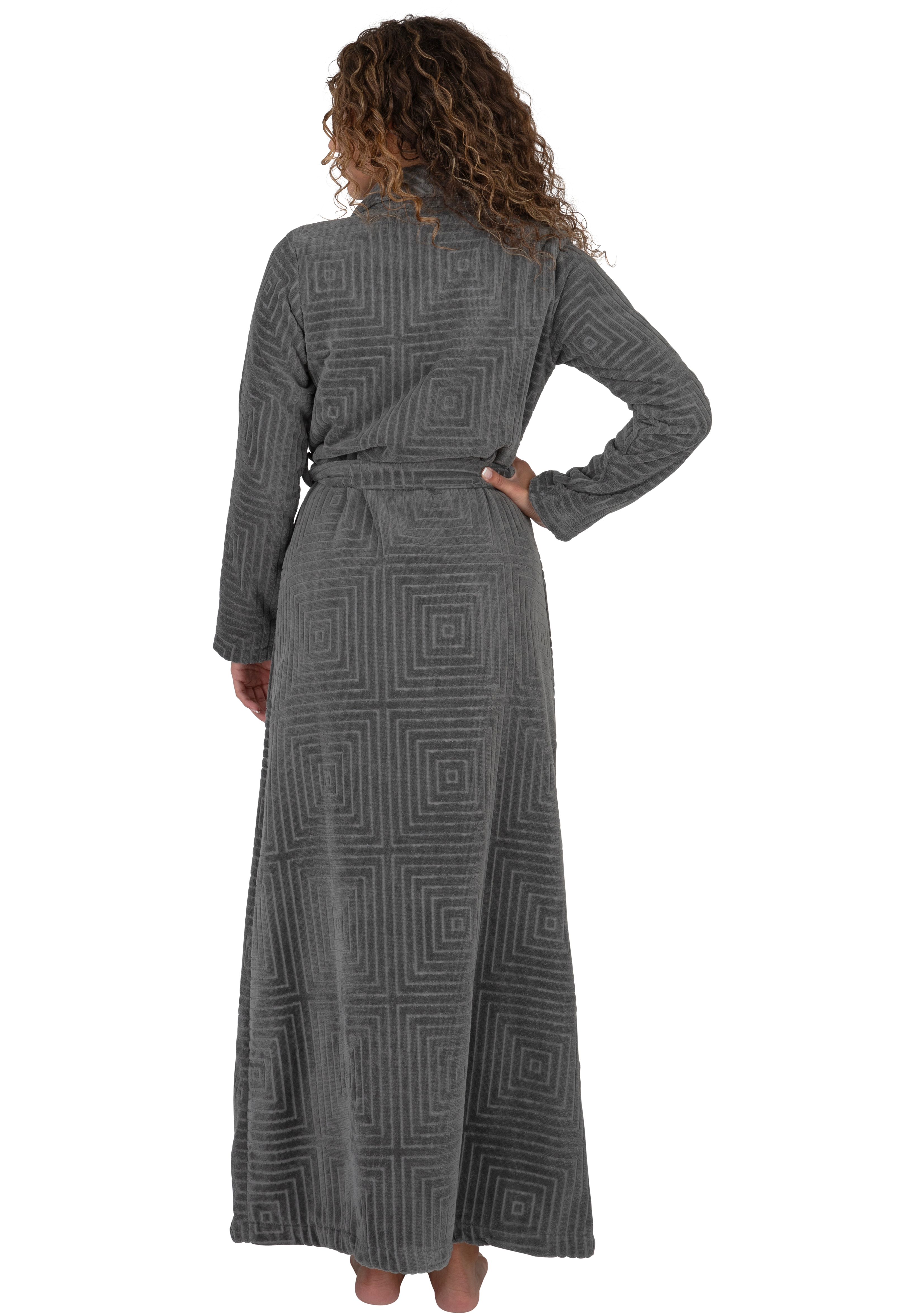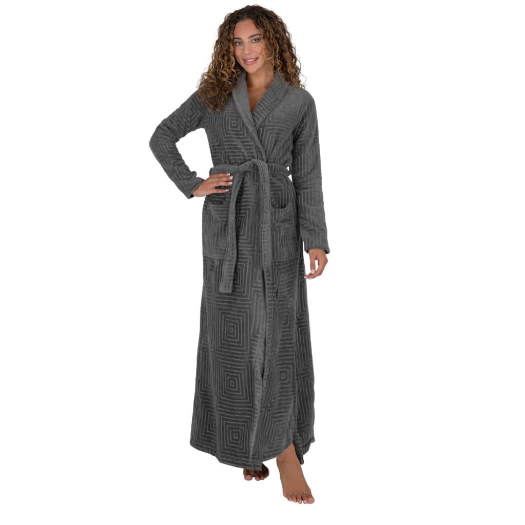 Terry Wrap Long Geometric Belted Bathrobe With Shawl Collar Gray