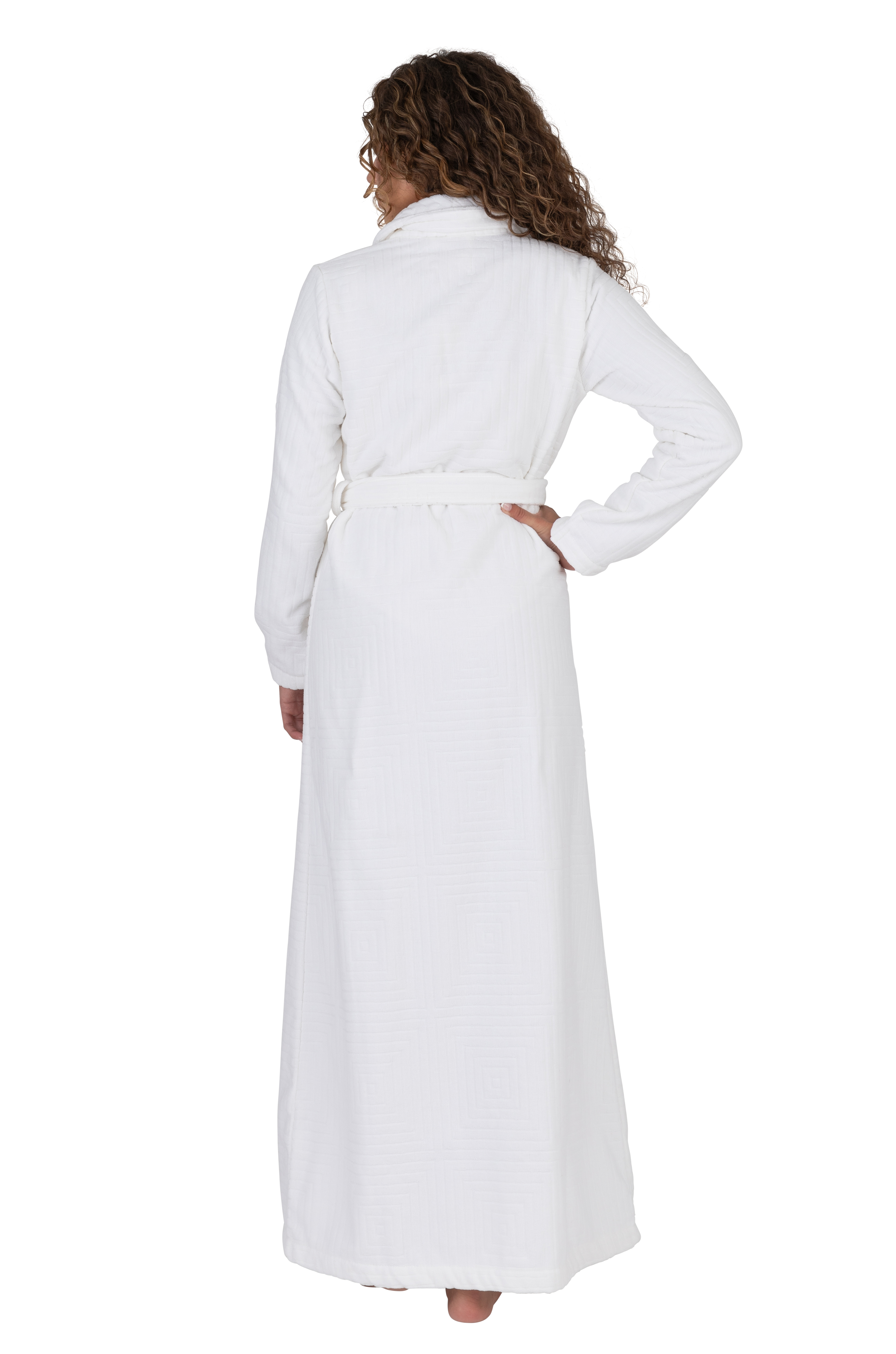Terry Wrap Long Geometric Belted Bathrobe With Shawl Collar White