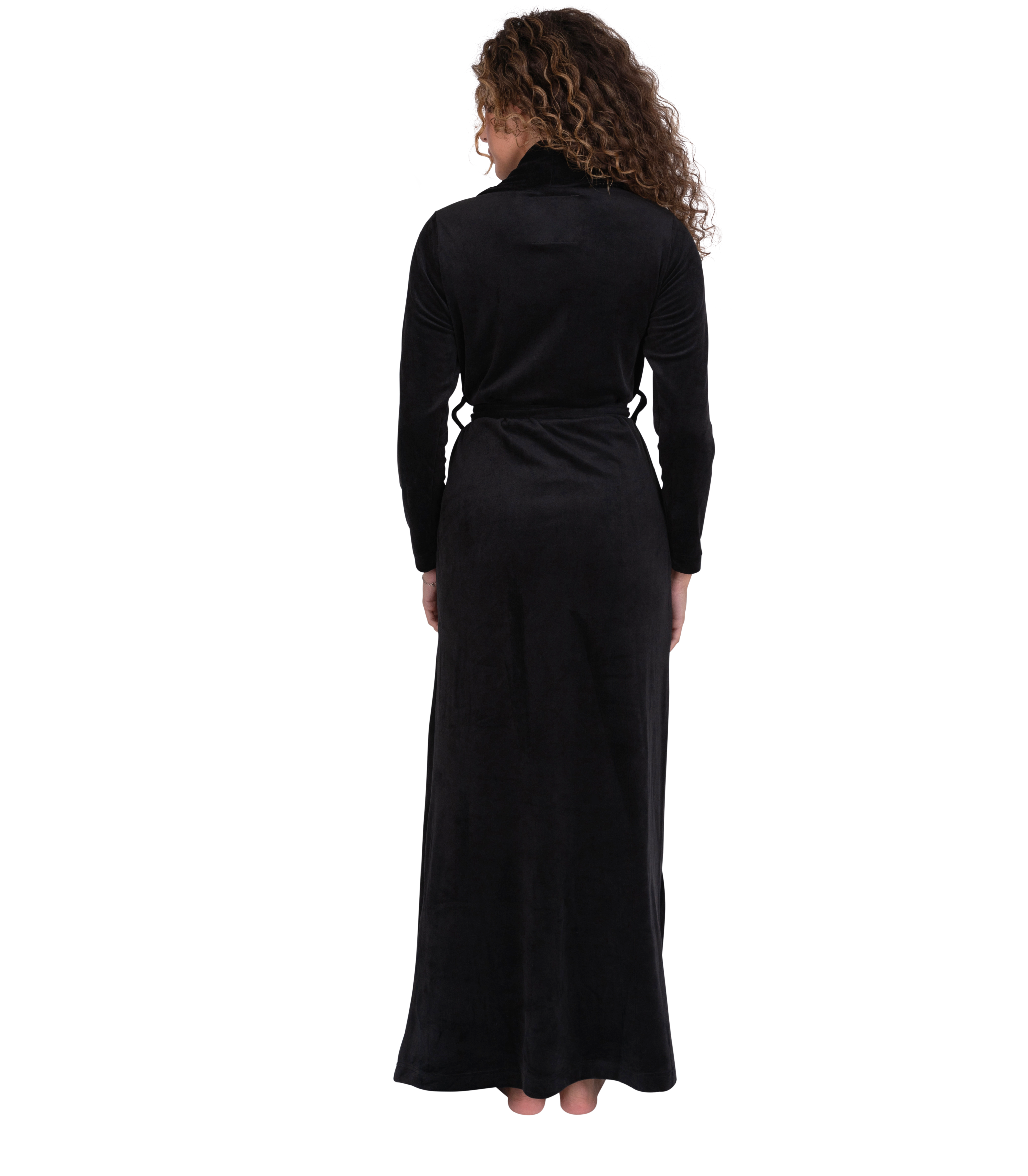 Luxurious floor length, belted wrap is constructed of plush, ultra soft velour.